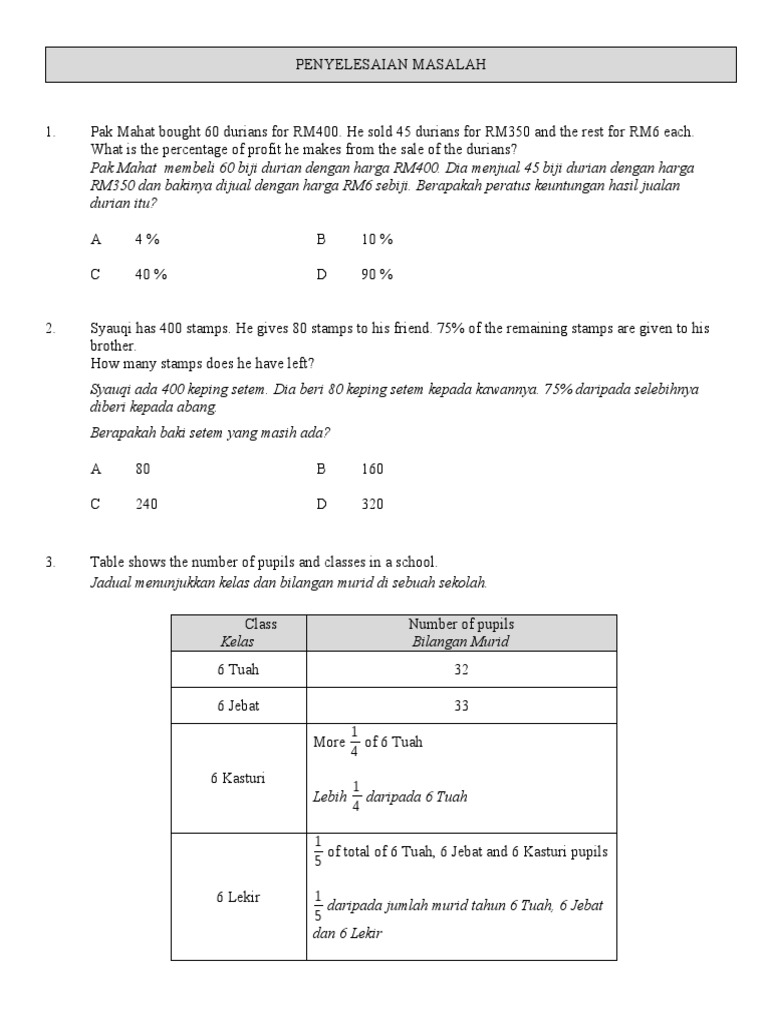 Related : Soalan Penyelesaian Masalah Matematik Tahun 3 / Modul Penyelesaian Masalah Matematik 5 / Teknik menyelesaikan soalan berkaitan penyelesaian masalah dalam matematik..