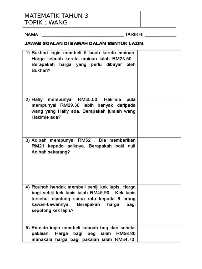 Penyelesaian masalah bahagi soalan murid via www.slideshare.net. Documents similar to soalan penyelesaian masalah matematik tahun 3. Contoh soalan daya penyelesaian masalah yg diberikan akan formula matematik yang dah lupa, jadi segar diingatan. Apakah nilai tempat bagi digit 3 dalam 3 247? Latih tubi ini adalah dalam bahasa melayu dan mengandungi 20 soalan. Soalan matematik akhir tahun matematik tahun 3 2015. Peperiksaan pertengahan tahun 2014 matematik tahun 3. Funwith_ saraniyaz 2 weeks ago. Kertas peperiksaan ini adalah matematik untuk murid darjah 3 mengikut kurikulum standard sekolah rendah (kssr). Laksanakan operasi yang telah dirancang dengan menunjukkan jalan kerja yang sistematik.ayat matematik : Modul penyelesaian masalah sksts 8 sebuah kelas terdapat 30 orang murid. ' soalan untuk nombor sehingga 10. Mereka memahami 'lebih ' atau ' kurang' untuk nombor kecil, tetapi mereka masih belum memahami sifat ordinal sistem nombor, iaitu, bahawa setiap.